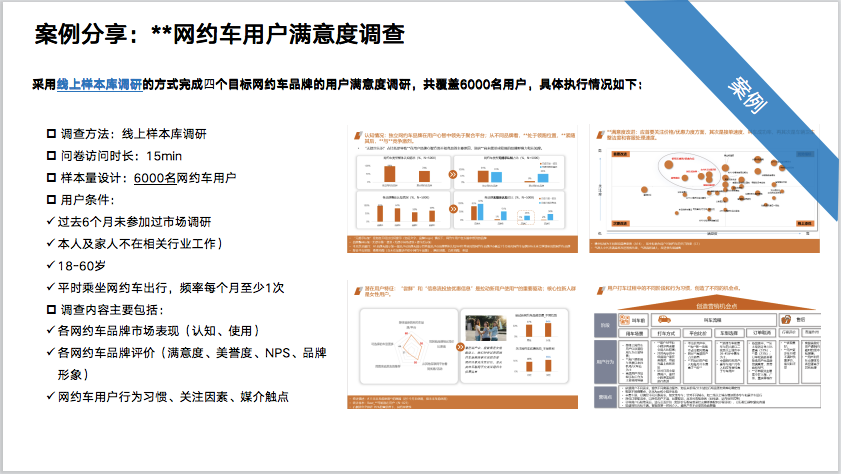 在线调研:在线设计问卷并向客户投放,收集他们对产品或服务的满意度信息,问卷可以包含多项选择和开放式问题,以便客户能够提供详细的反馈和建议。深度访谈:与客户进行一对一交流,可以更深入地了解他们的需求和意见。深度访谈能够建立更直接、深入的沟通渠道,有助于发现潜在的问题和需求。电话调查:通过电话与客户进行沟通,询问他们对产品或服务的满意情况。社交媒体调查:在社交媒体平台上发布调查问卷或话题讨论,吸引客户参与调查。焦点小组讨论:组织一组具有代表性的客户进行讨论,集中收集他们对产品或服务的看法和意见。焦点小组讨论有助于发现共同点和差异点,为改进产品或服务提供依据。神秘顾客:启用独立的第三方调查员或神秘顾客,在未知的情况下测试产品或服务,并评估客户满意度和购买体验。神秘顾客能够模拟真实客户的购买行为,发现潜在的问题和不足。拦截访问:通过在商店大堂、商业街区、公共场所等地方拦截被调查者,从而寻求交谈机会并收集信息。